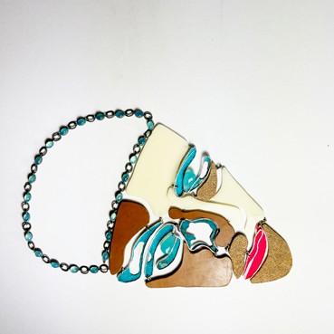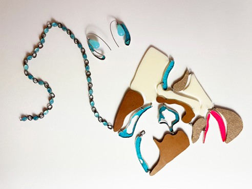 "schwimmerin" 2022 necklace/earings/collage silver, pigment, acryl glass, leather, particle board, chalcedon 17 x 23 cm